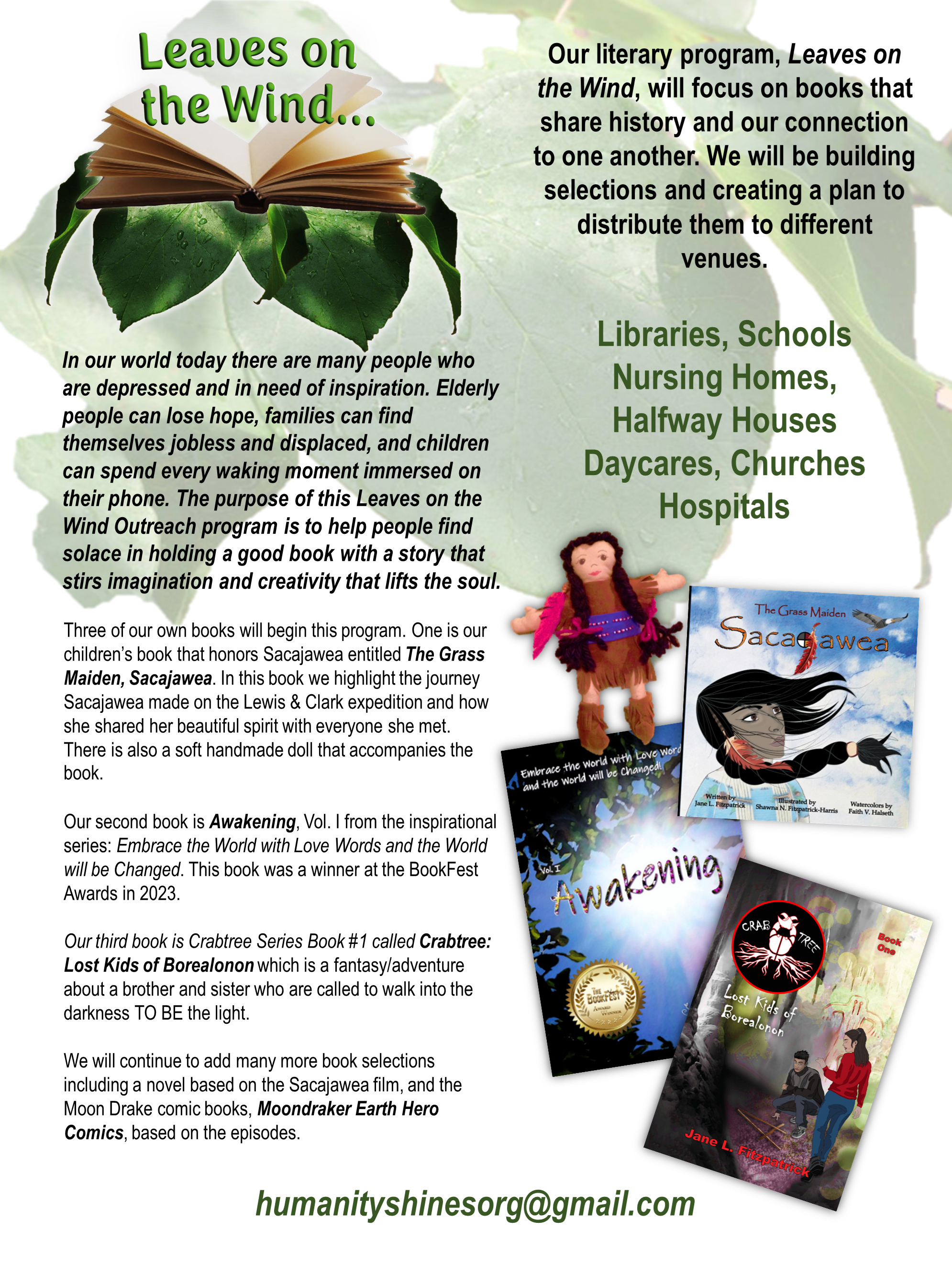 Our online store is where people can help Humanity Shines fulfill its ongoing mission when they purchase products from the store. 100% Net from every item sold in this Spirit Wind Shop goes to nonprofit causes.