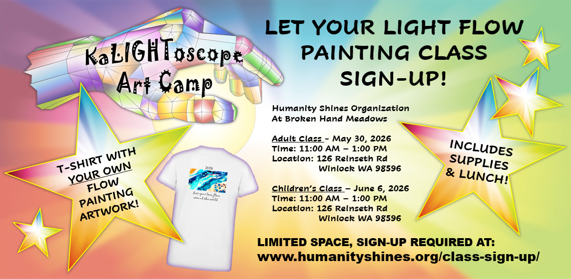 2) A KaLIGHToscope Art Camp T-shirt with your Flow Art on the back, and an inspirational phrase inspired by your design.