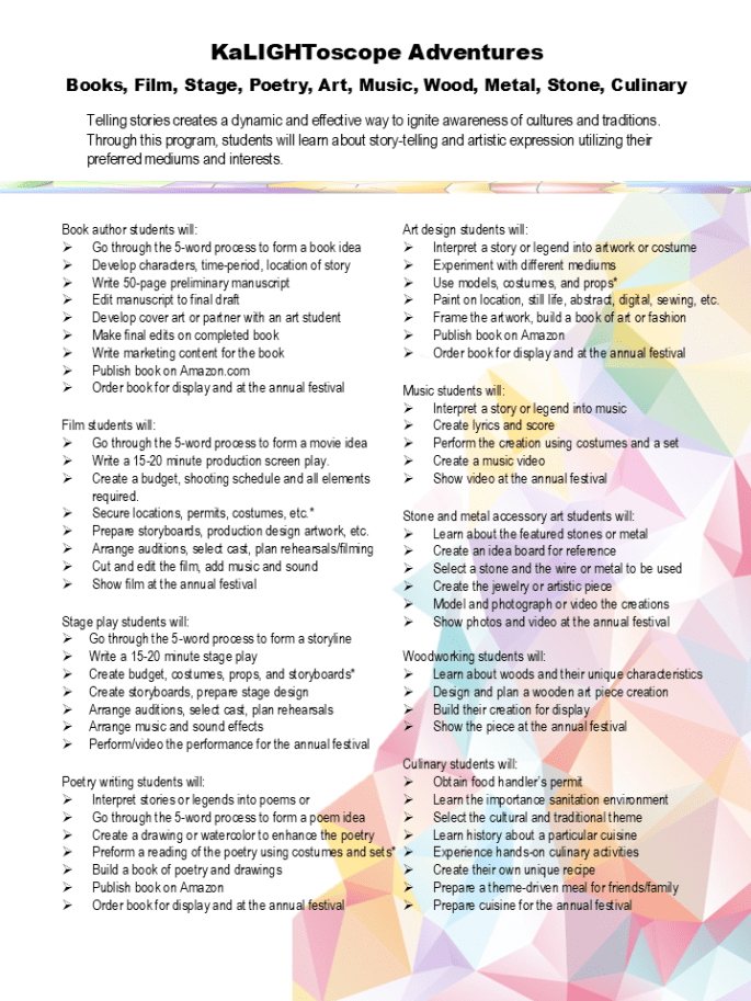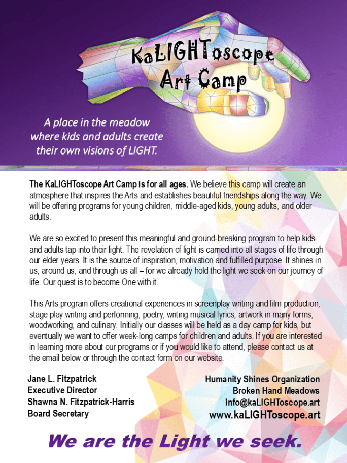 KaLIGHToscope Art Camp – helps kids and adults embrace their internal light, gather it all together, and through their unstoppable imagination create a masterpiece. We believe this process will also help them have a deeper understanding of what they are called to share through the gifts they’ve been given. Once we build our new administration building “The Light House,” we plan to host an annual festival where kids and adults can display their work, perform their music and plays, and share their books. It will be an unforgettable event.