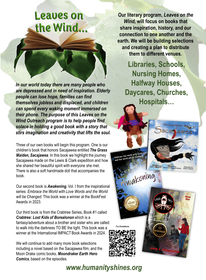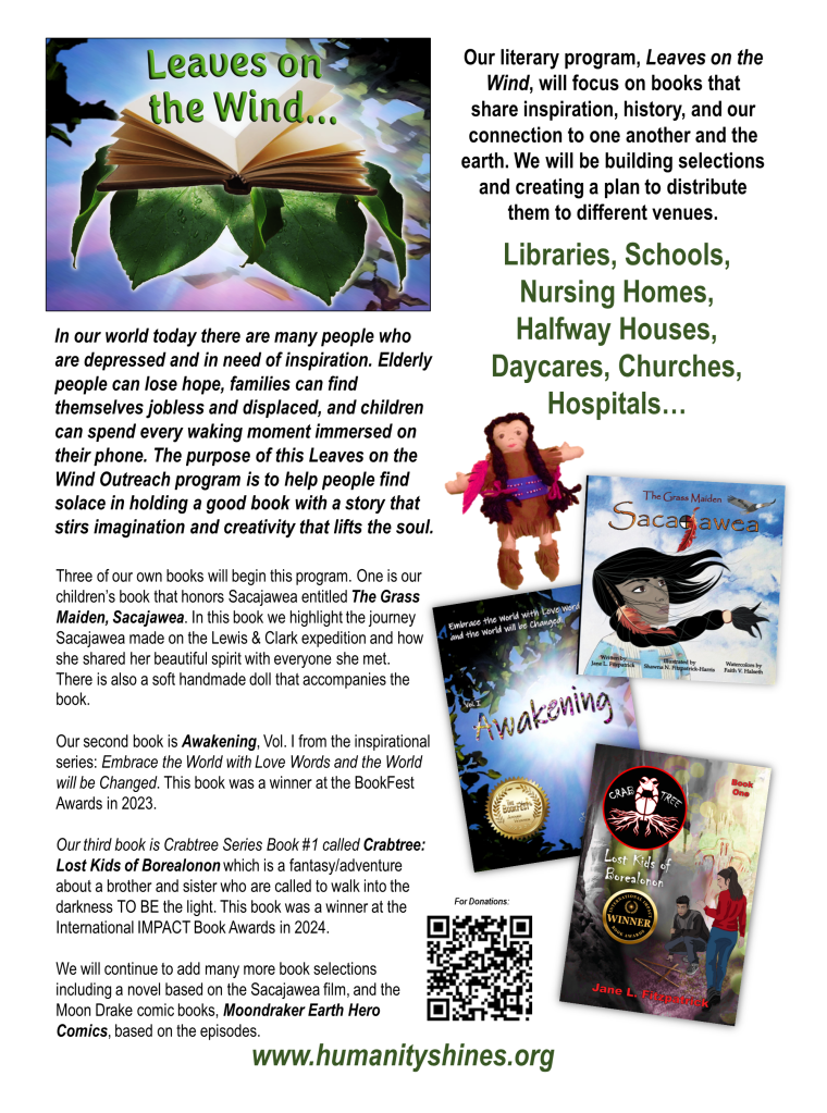 Our literary program, Leaves on the Wind, focuses on books for all ages that share spirit-driven stories, unforgettable characters of history, and the power that connects us all. We continue to build our book selections and are distributing them to different venues, see the flyer below.