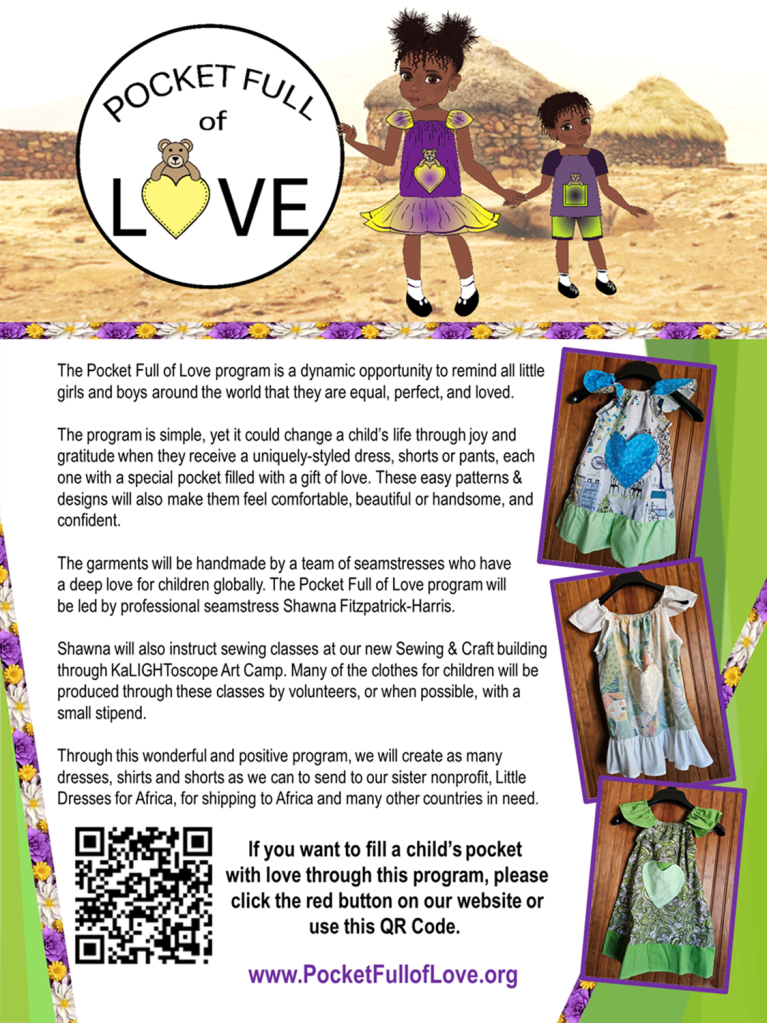 So many children in Africa and other countries are suffering from insufficient food, housing and clothing. This Pocket Full of Love program will provide handmade dresses, shirts & pants to these children of the world. It will also provide a toy stuffed animal or doll in the front pocket of each dress or shirt. These toys will be constructed out of similar fabric and give the child a cute little “someone” to hold and hug.