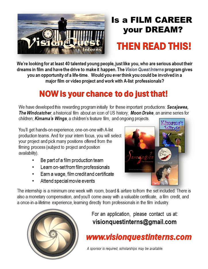 Our Vision Quest educational program supports two functions. First, to add to our associated film productions, we present our Vision Quest Interns program for both native and non-native young people who have a passion for filmmaking. This internship program will provide professional hands-on and motivational training to future filmmakers, age 18-27. We ask for your scholarship support to help us bring this opportunity to interns, as it will be a paid experience of a lifetime and they will be part of an epic feature film production about Sacajawea, the Moon Drake series, Kimama’s Wings, and many other film projects and educational programs.