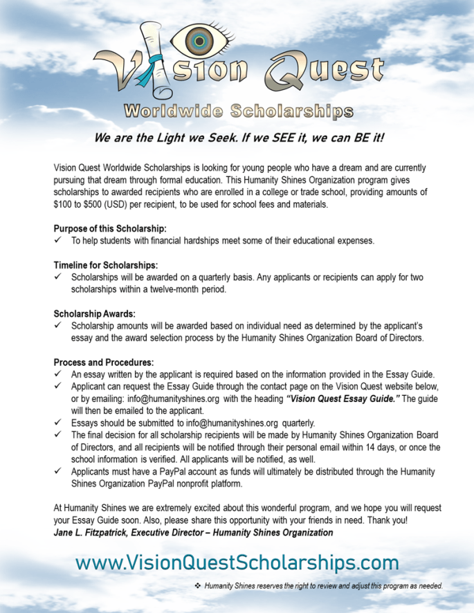 Through our second Vision Quest function, we are happy to launch Vision Quest Worldwide Scholarships for students enrolled in either a college or trade school, to provide funds for smaller expenses including books, testing and other fees, etc. Scholarships amounts range from $100 to $500 depending on need. Candidates write an essay based on our guidelines and include their school and counselor information. The Humanity Shines Organization Board of Directors select all recipients. This scholarship program is available on a quarterly basis.
